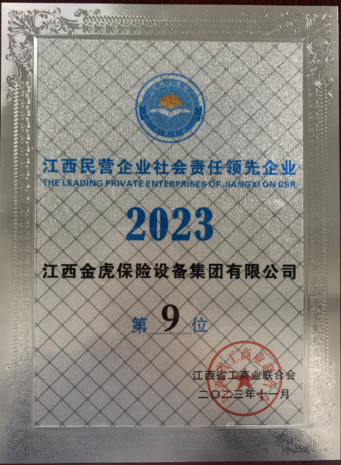 2023年11月3日,2023江西民營企業(yè)100強和社會責任發(fā)布會在南昌召開,會上對泰豪集團、金虎集團等10家入選社會責任領(lǐng)先企業(yè)代表頒發(fā)了證書,金虎集團位列2023江西民營企業(yè)社會責任領(lǐng)先企業(yè)第9位。